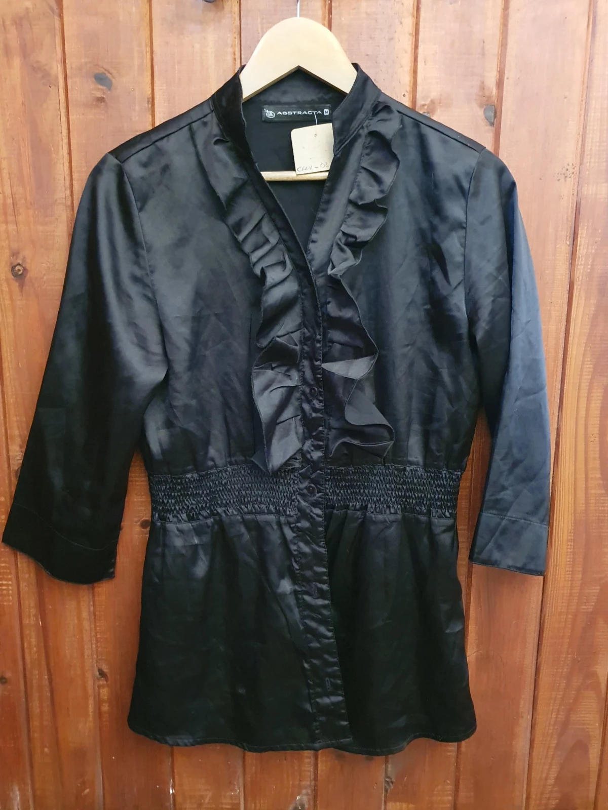 Hermosa camisa de raso negra, manga ¾, entallada y corte princesa.